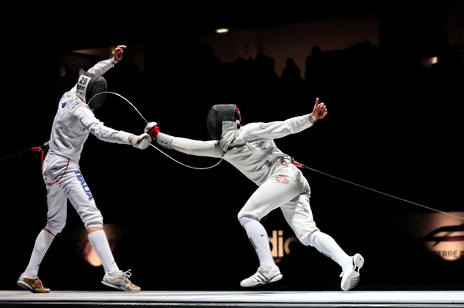 - Le cadrage : la photo a été assez sérieusement recadrés à 3,132 × 2,081 pixels pour 4288 x 2848 photosites d'origine. Le recadrage est parfait, il y a de l'air à droite qui renforce la poussée en avant de compétiteur suisse et la proximité du compétiteur italien avec le bord gauche renforce aussi le blocage de celui-ci ;